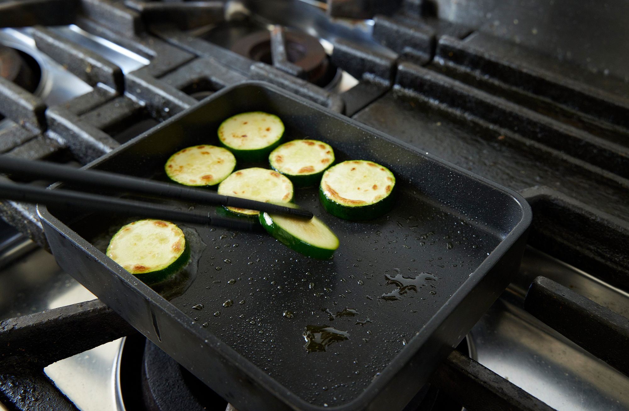 - なすやズッキーニを1.5cm幅に切り、オリーブオイルと塩を適量かけ、焼く。